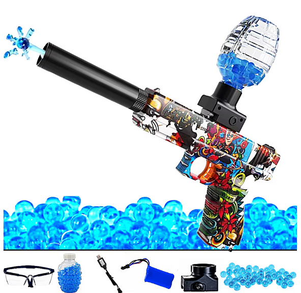 Un pistol cu bile de gel din plastic, acoperit cu o grafica extrem de interesanta si atragatoare.